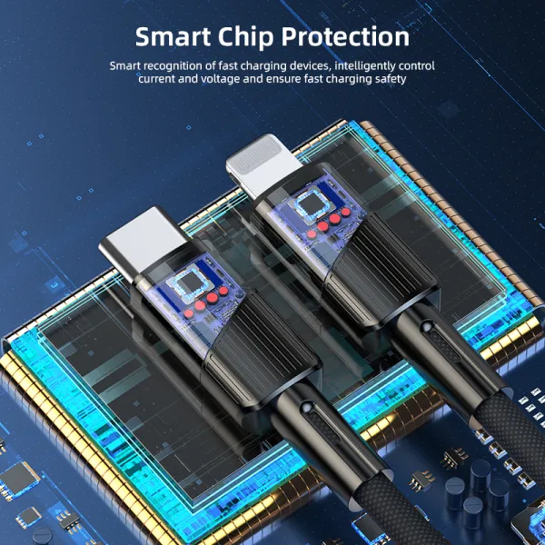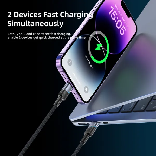 Type-C and Lightning connectors integrated into one sleek cable — effortlessly power your laptop and phone at the same time.Smart Chip Protection