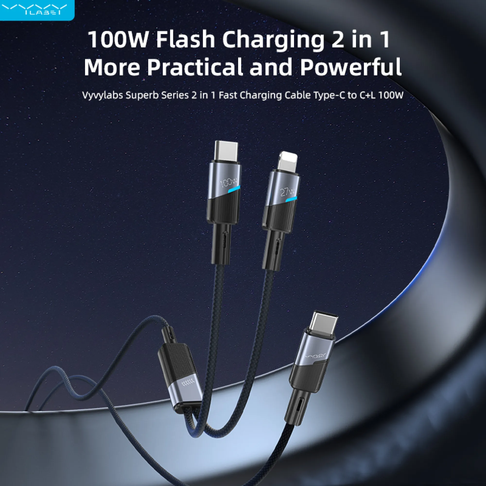 Engineered for professionals and creators on the move, the Vyvylabs Superb Series 2-in-1 Cable merges power, precision, and durability.