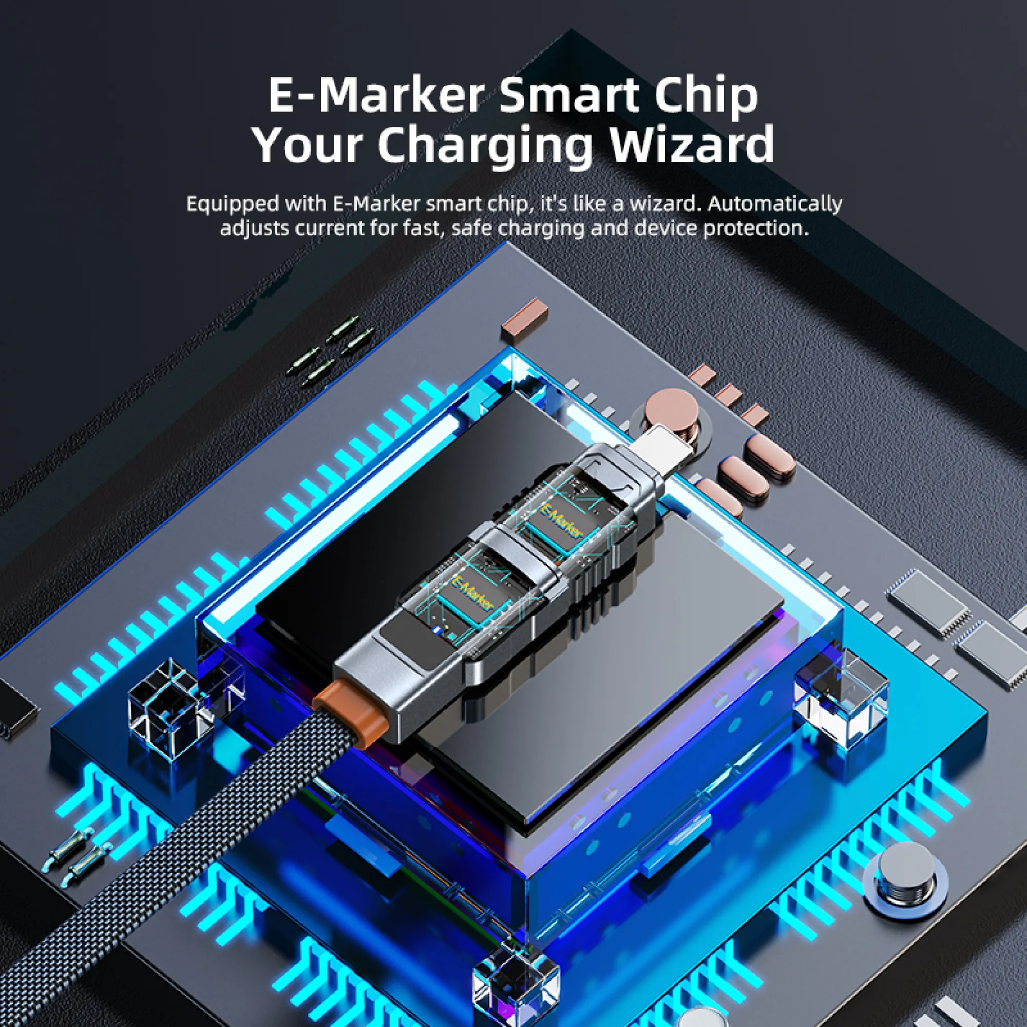 Switch seamlessly between USB-C, Lightning, and USB-A combinations. Whether it’s Type-C to C, Type-C to iPhone, or USB-A to Type-C — this single cable adapts to every device you own.E-Marker Smart Chip Protection