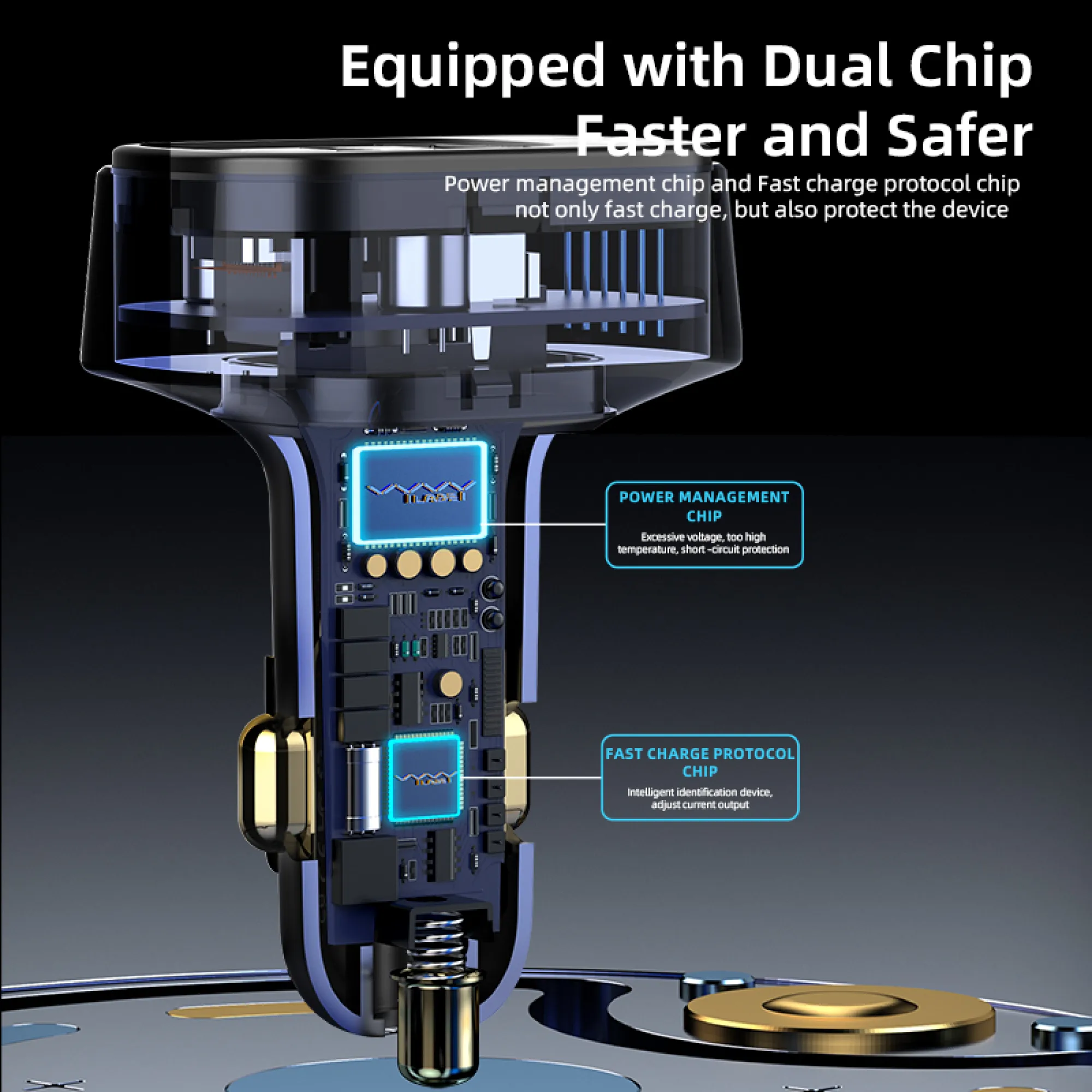 Crafted from premium aluminum alloy with an enhanced thermal structure, this charger maintains lower temperatures even during long drives, ensuring stable performance and reduced energy loss.Dual Smart Chip System for Safety and Speed
