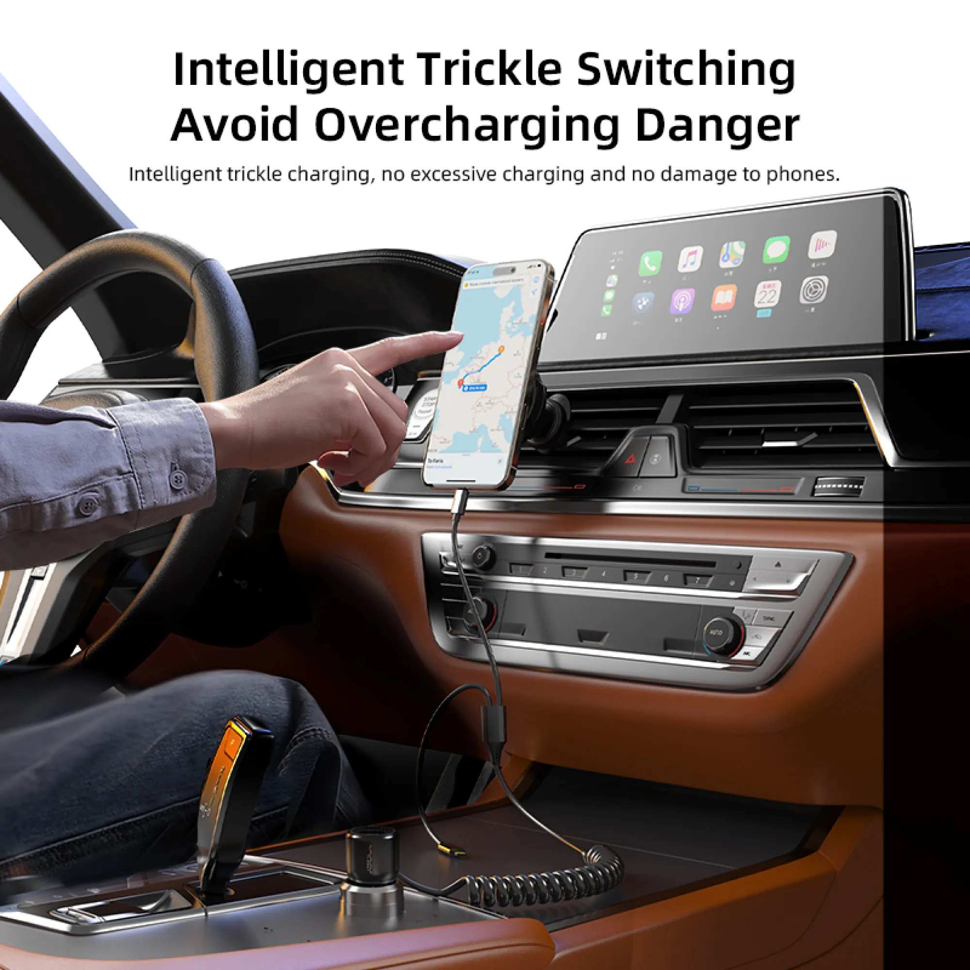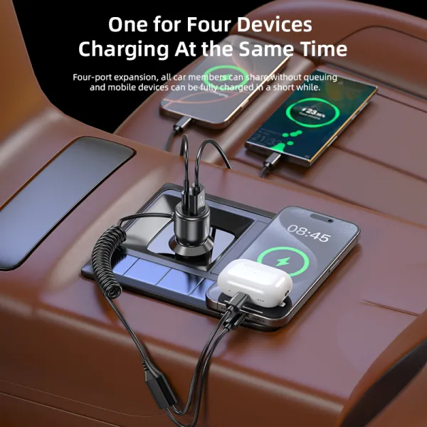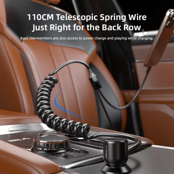 The built-in coiled cable extends up to 110cm and retracts neatly back to 43cm, keeping your car tidy and clutter-free. Perfect for passengers in the back seat — charge and use your phone freely without cable mess.Compact Yet Powerful