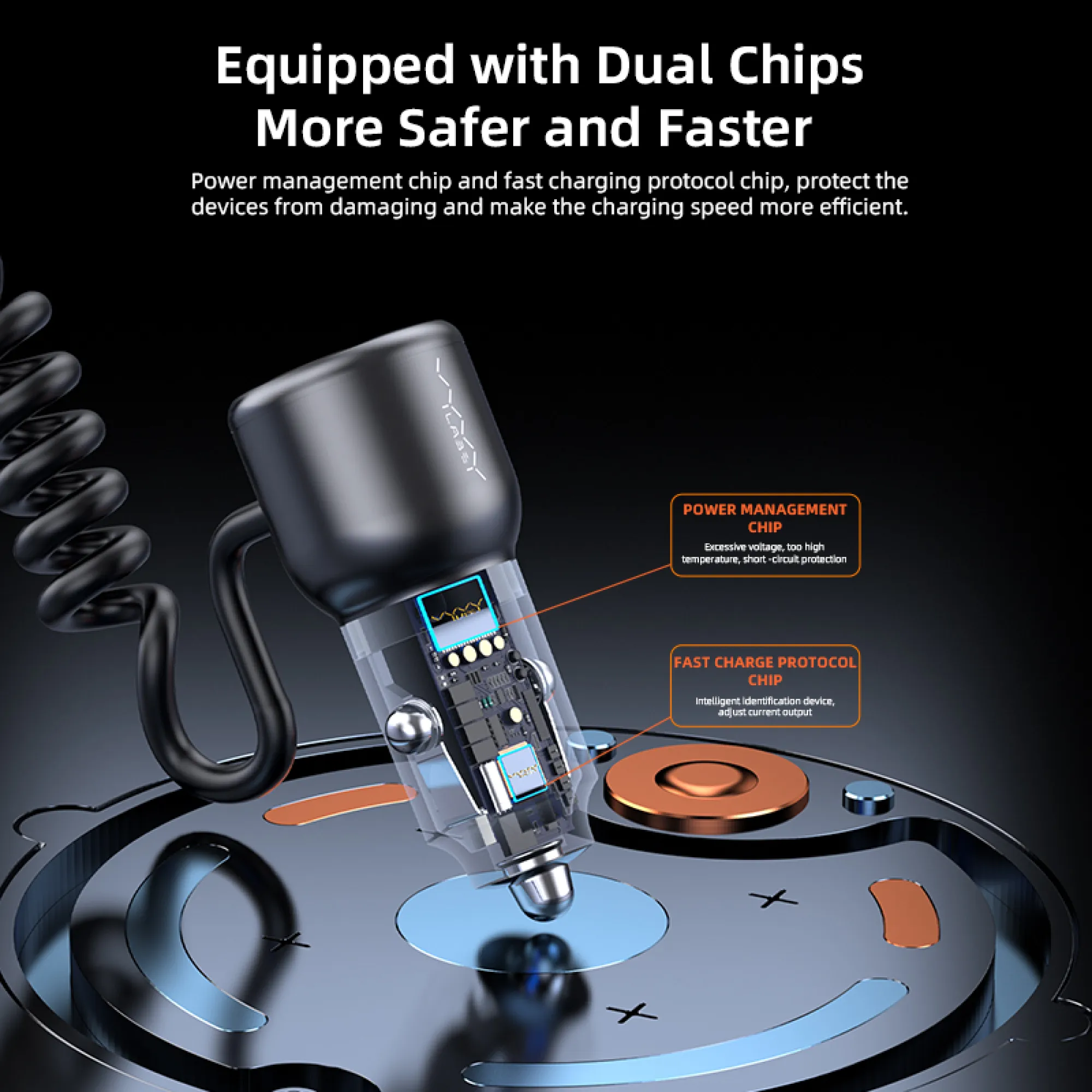 A smaller body with a premium metallic texture — stylish, modern, and powerful. Designed to blend seamlessly with any car interior while offering faster, more efficient charging.Advanced Heat Dissipation System